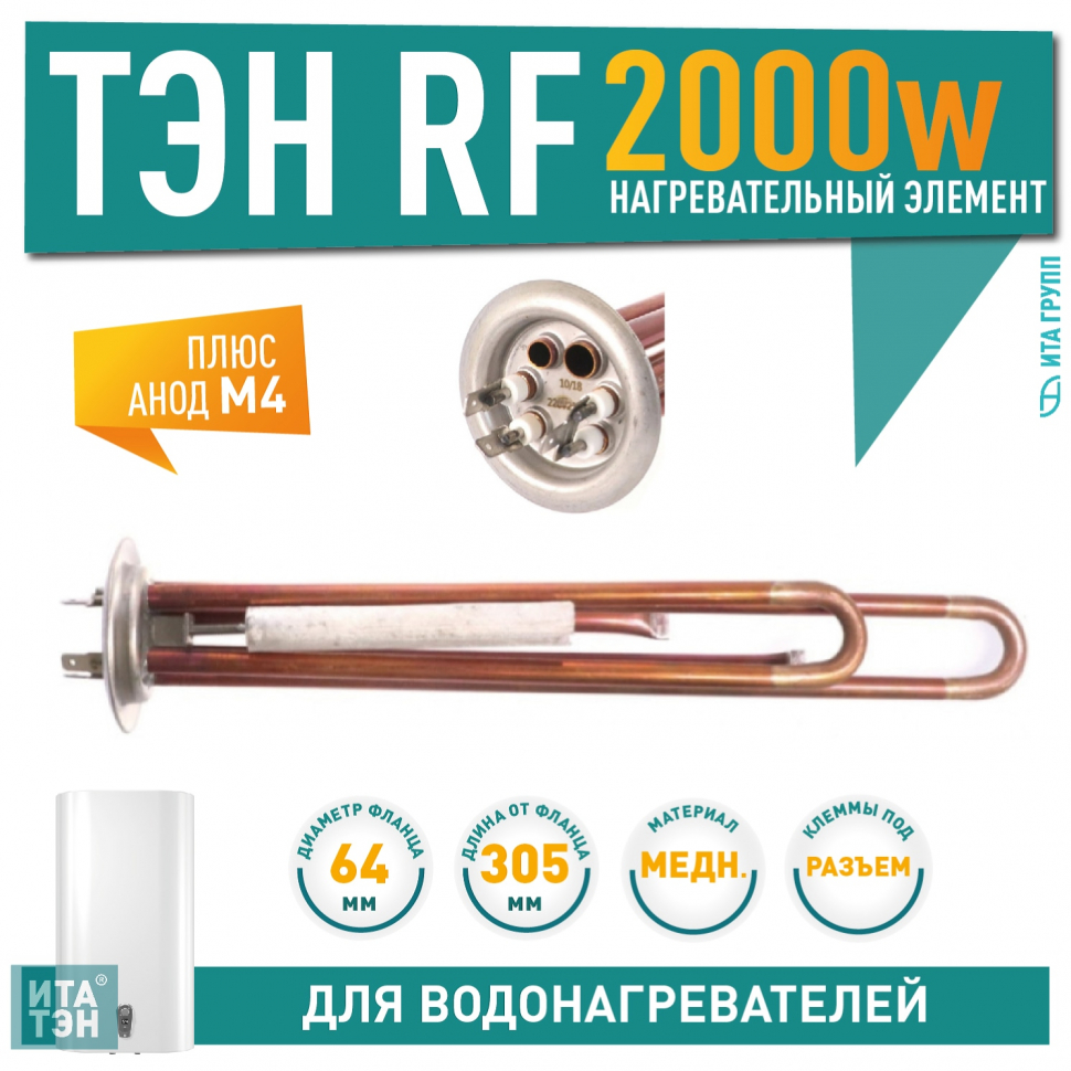 Ремкомплект для водонагревателя Thermex RZL, IS, IR, Garanterm, Electrolux EWH с ТЭНом RF мощностью 2000Вт, длиной 305мм и диаметром фланца 64мм, магниевым анодом с диаметром резьбы М4 и уплотнительной резинкой.