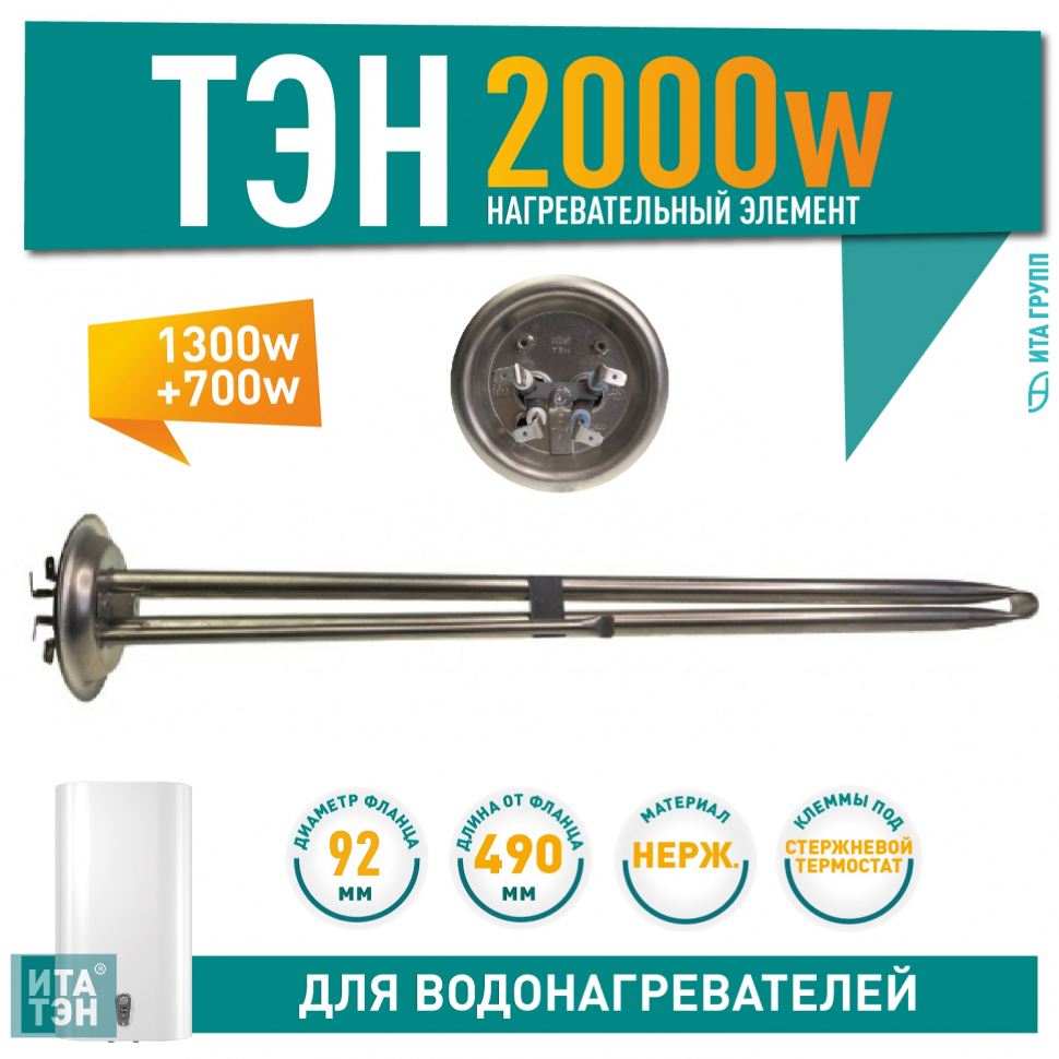 ТЭН мощностью 2000 Вт обеспечивает быстрое и равномерное нагревание воды. Имеет два контура нагрева: 700 Вт и 1300 Вт, что позволяет регулировать интенсивность нагрева в зависимости от потребностей. Длина ТЭНа – 490 мм, диаметр фланца – 92 мм. Клеммы под разъём обеспечивают простое и надёжное подключение. Предусмотрено крепление под анод M4. Рабочее напряжение — 220 В, подходит для использования в бытовых условиях.